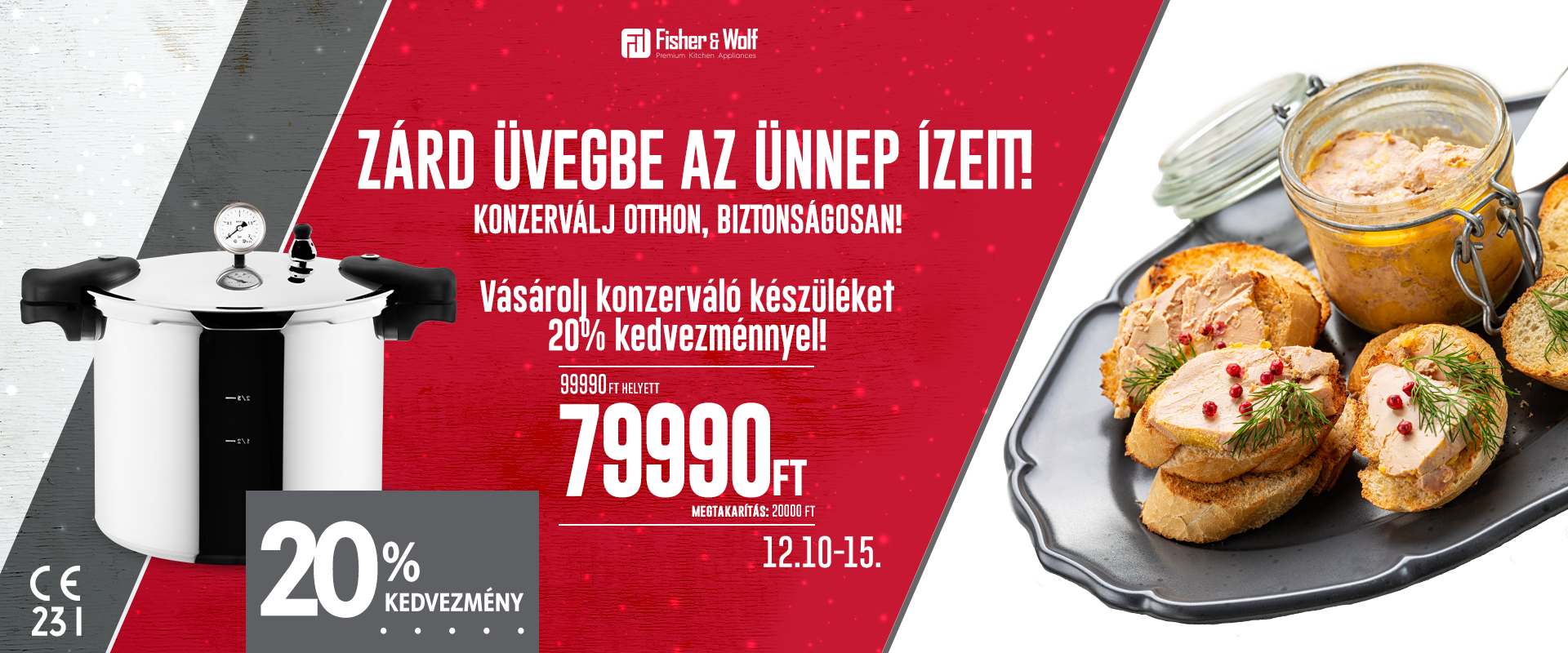 December 10-15. között 20 % kedvezménnyel, azaz 79.990 Ft-ért tudod beszerezni a Fisher&Wolf háztartási konzerváló készülékünket! Spórolj 20.000 Ft-ot!